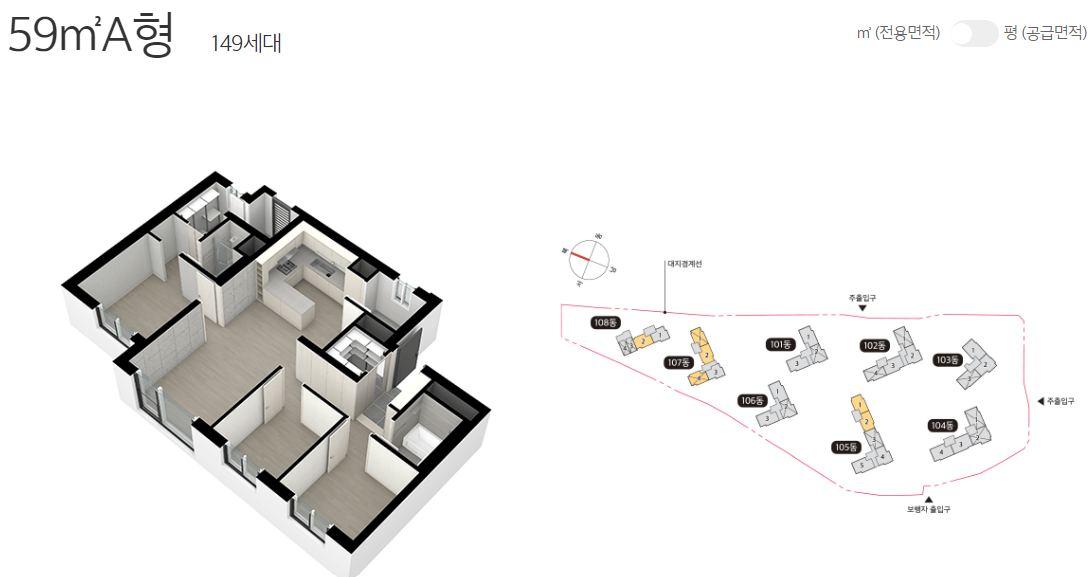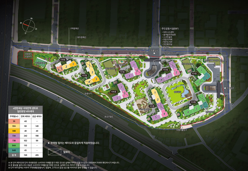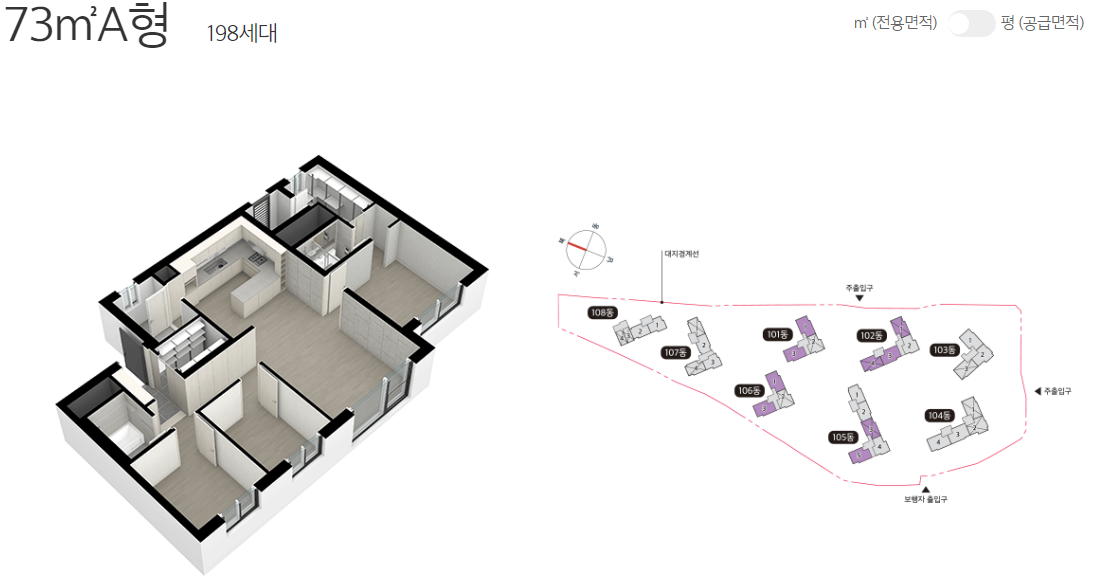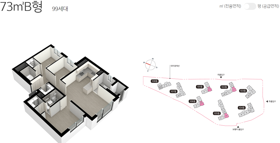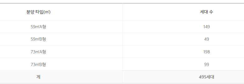 일반 공급되는 물량은 59㎡ 198가구 73㎡ 297가구이며 각각 2개 타입이 준비되는데요. 판상형과 타워형을 적절히 배치하여 수요자들의 니즈를 잘 반영했다는 평입니다.