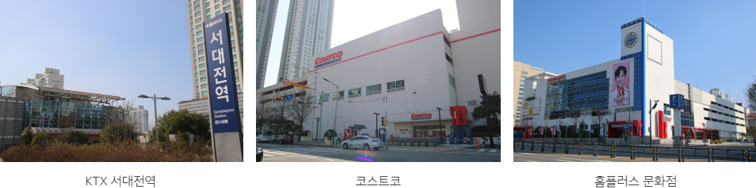 이편한세상 서대전역 센트로 근처에는 롯데백화점, 코스트코, 홈플러스 등의 대형 생활 인프라는 물론 의료와 금융 서비스, 먹자골목 등의 필수 시설이 밀집되어 있는 풍부한 인프라도 강점 중 하나입니다. 도보 거리에 있는 서대전역에서 KTX 광역철도를 이용하면 전국 주요 도시까지 빠르게 도달합니다. 또한 지하철 1호선 서대전네거리역도 가까이에 있어 역세권 프리미엄을 누립니다. 아울러 자동차를 이용하는 분들은 서문로, 계백로를 통해 시내 이동도 용이합니다.