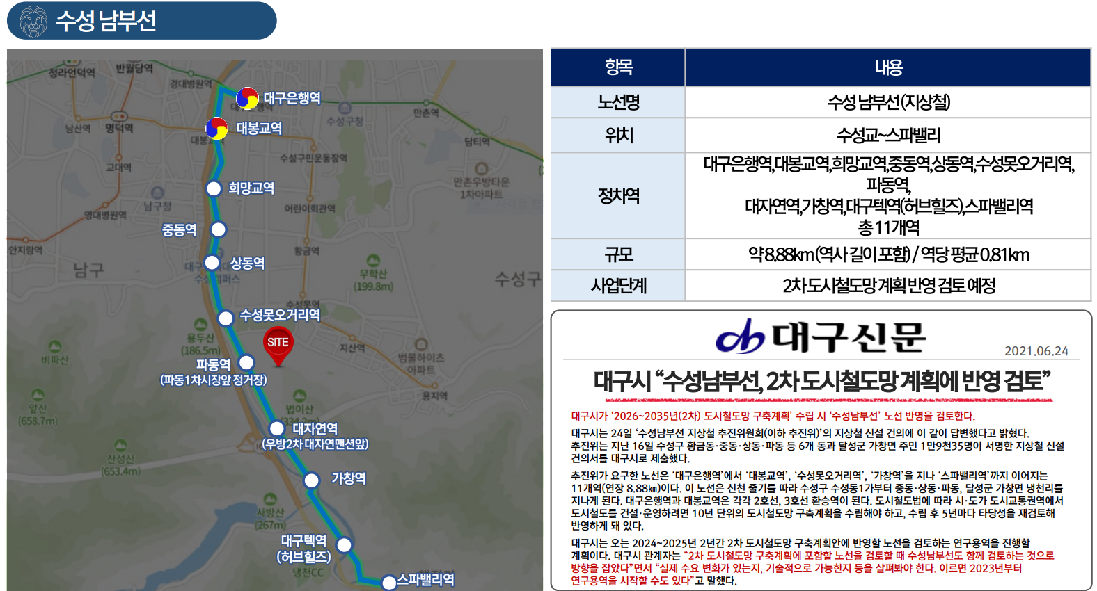 경부고속도로와 대구부산고속도로에 진출입이 수월하여 전국 광역 접근성도 양호한데요. 주변 버스정류장을 이용한다면 약간의 시간이 소요되어도 지하철 3호선 대중교통을 탑승할 수 있습니다. 교통호재로 수성남부선 지상철도가 있는데요. 개발이 확정된다면 역세권 입지를 가지게 되므로 상승효과를 기대할 수 있습니다.