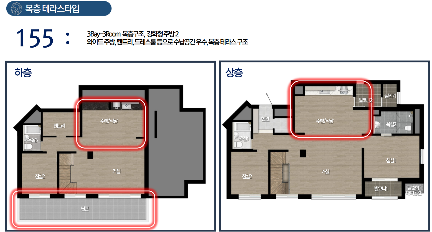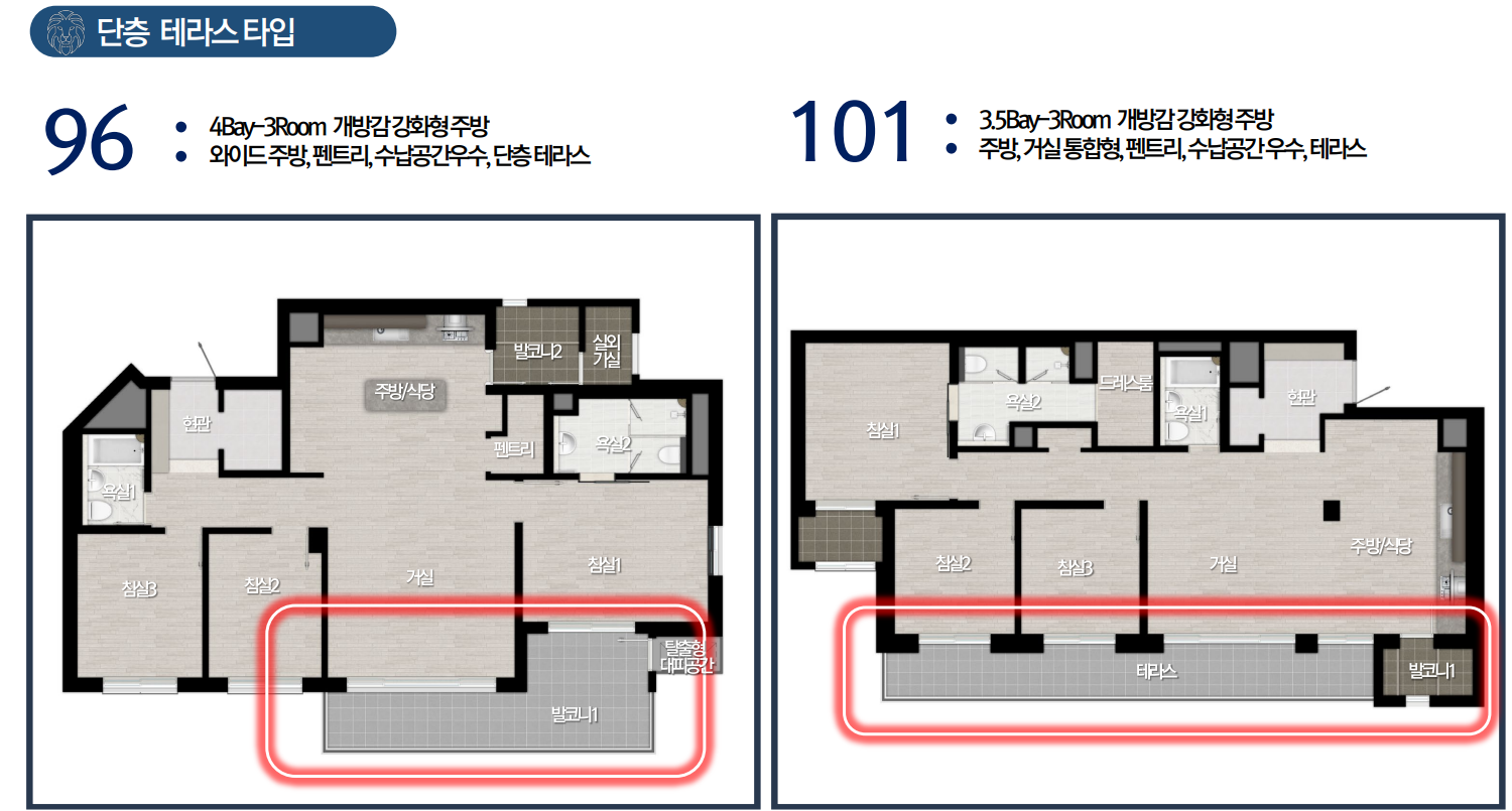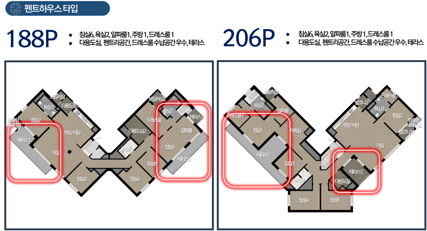 대형 평형인 96, 101은 테라스가 멋진 구조로 전원 생활을 즐길 수 있으며 나만의 정원이나 캠핑, 카페 등을 가꿀 수 있으 특별함을 가집니다. 임대보다는 실수요층의 선호도가 높을 듯합니다. 이 밖에도 테라스가 있는 복층구조로 두 가정이 거주할 수 있으며 소음 차단에 효과적입니다. 주거 트렌드를 반영한 펜트하우스 142, 188, 206타입도 소량 배치됩니다.