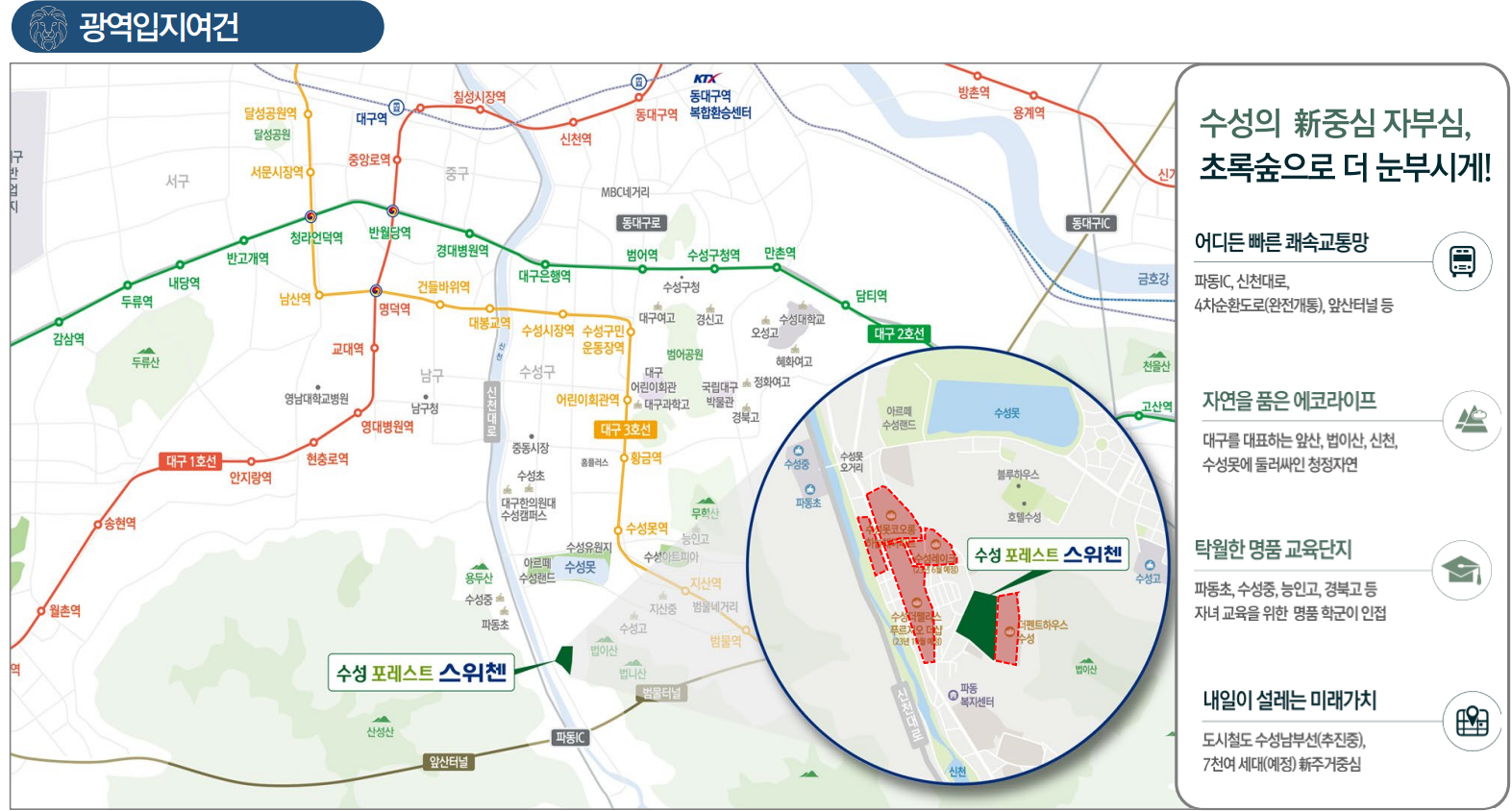 수성 포레스트 스위첸은 특히 수성구 내에서도 자연 인프라가 풍부한 지역에 자리합니다. 앞산과 법이산, 신천, 수성못에 둘러싸인 친환경 입지로 에코라이프가 실현되며 능인고, 경북고 등 명품 수성 학군을 품어 교육 여건도 뛰어납니다. 홈플러스, 중동시장, 수성아트피아, 국립대구박물관 등 수성 인프라 생활 특권을 누리게 되겠습니다.