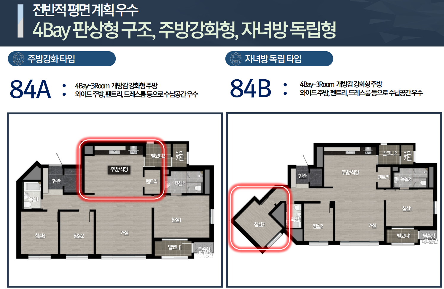 84A는 4BAY로 주방 강화형으로 아알랜드 싱크대가 겹합되어서 럭셔리하게 구성되는데요. 가정 내에 동선을 최적화하며 전면창에 일조량이 우수합니다. 84B와 C는 판상형에 자녀방이 독립된 구조입니다. 침실 2개와 거실이 나란히 전면 배치되어 따스한 자연채광을 만낏할 수 있으며 침실 하나만 별도로 떨어져 있습니다.
