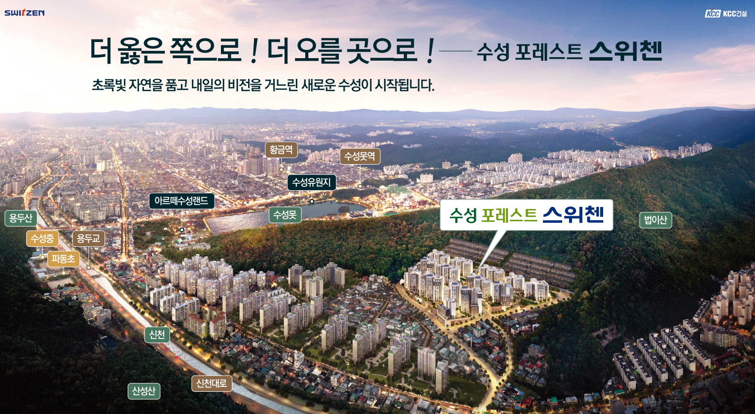 수성 포레스트 스위첸은 특히 수성구 내에서도 자연 인프라가 풍부한 지역에 자리합니다. 앞산과 법이산, 신천, 수성못에 둘러싸인 친환경 입지로 에코라이프가 실현되며 능인고, 경북고 등 명품 수성 학군을 품어 교육 여건도 뛰어납니다. 홈플러스, 중동시장, 수성아트피아, 국립대구박물관 등 수성 인프라 생활 특권을 누리게 되겠습니다.