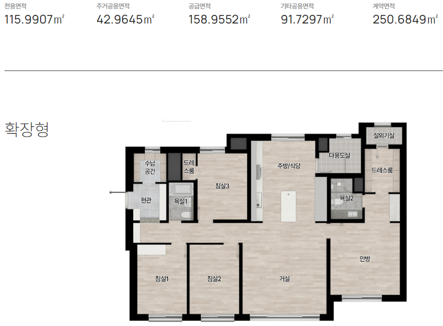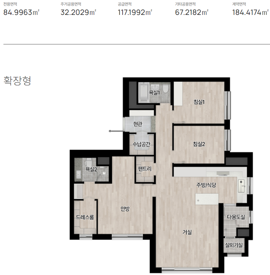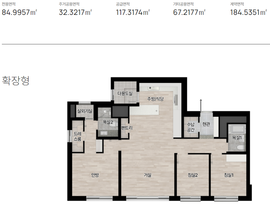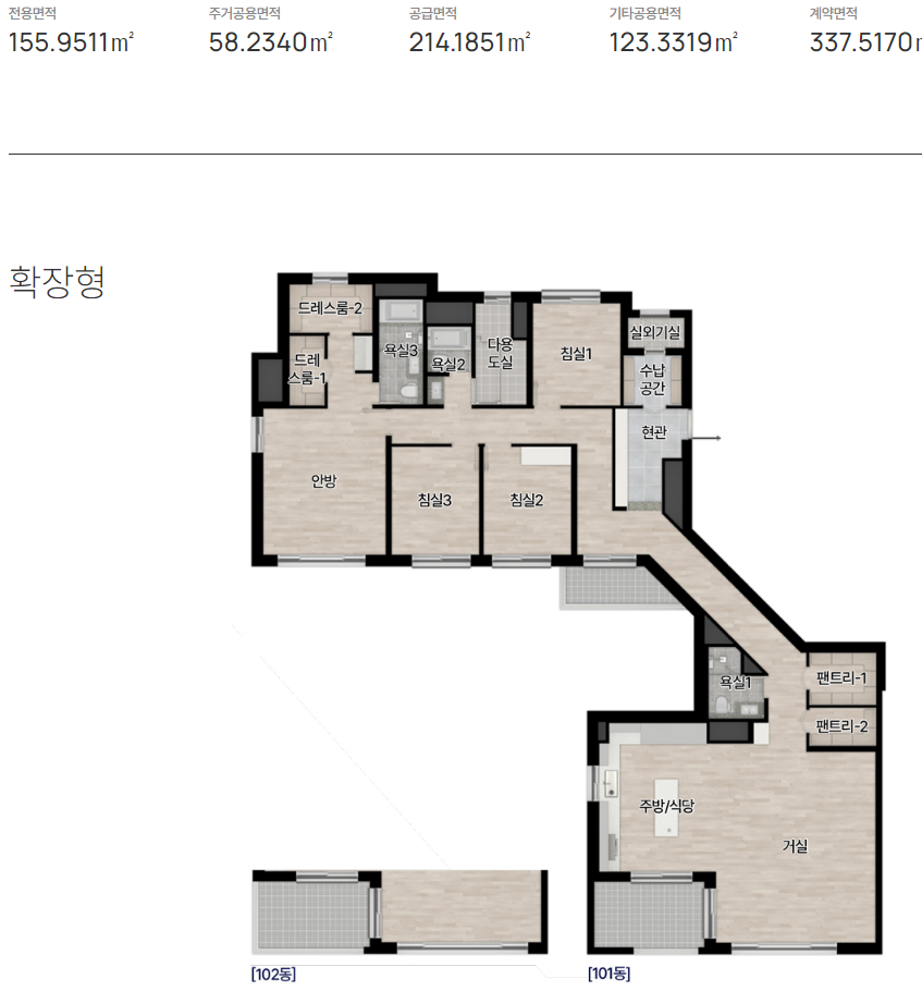 국평인 84㎡ A의 평면도를 보면 3베이, B타입은 4베이 판상형으로 두곳모두 주방과 거실의 맞닿은 창을 통한 자연환기에 유리하고, 안방을 포함 3개의 침실과 2개의욕실을 기본으로 구성하며, C타입은 LDK 타워형으로 개방감이 극대화 됩니다. 102㎡ 유닛부터는 알파룸을 포함 4개의 침실이 더해지면서 대가족인원을 수용하기에도 적합해 보이네요.