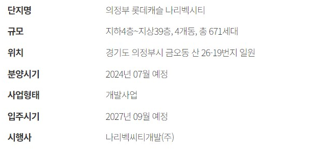 사용개요를 보시면 공급소재지의 주소는 의정부시 금오동 산26-19번지 일원이며, 1군브랜드 현장이고, 대지면적은 20,435㎡, 연면적은 145,502㎡, 용적률과 건폐율은 각각 435%, 21%이며, 건축물은 지하4층을 시작으로 지상은 최고높이 109m에 달하는 39층높이의 공동주택 4개동에 총 671세대 규모로 조성된다고 합니다.