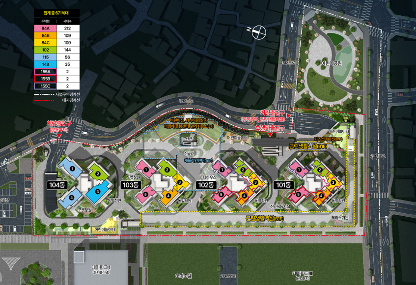 전체적으로 남향위주의 동배치를 적용해 일조량을 안정적으로 확보하고, 내부로 입주민들이 서로 소통할수 있는 썬큰과 수공간이 어우러진 광장과 티하우스, 포켓및 동앞정원, 어린자녀들을 위한 놀이공간을 계획하고 있습니다.