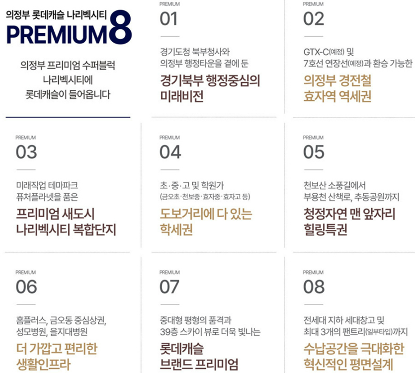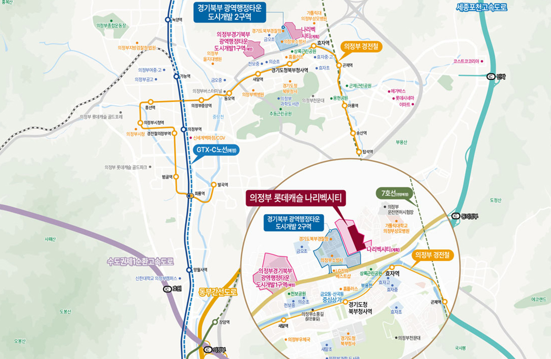 먼저 당 사업지는 주거와 업무, 상업, 공원, 미래직업 테마파크 퓨처플라넷등의 문화시설이 함께 조성되는 복합단지인 나리백시티에 위치해 있으며, 인근 금오동과 신곡동은 공동주택 80%이상이 입주 10년이상된 노후화가 진행된 아파트로 20년이상된곳도 절반이 넘어서면서 기존주택소유층도 신축으로 이전을 희망하는 잠재수요층이 많은곳이기도 하죠. 의정부 롯데캐슬 나리벡시티가 많은 장점을 가지고 있지만 그중에서도 단연 돋보이는 입지환경은 교통여건이 아닐까 싶은데요. 경전철 노선인 효자역을 도보권내에 두어 오랫동안 시장내 스테디셀러로 자리매김해온 역세권의 프리미엄을 가지게 되는데요.