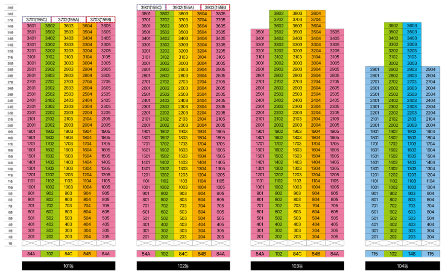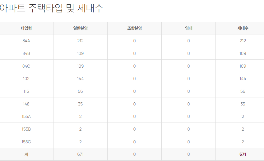 공급 면적은 84/102/115/148/155㎡이며 총 9개 타입으로 구체화됩니다. 세대수는 84A타입 212세대에 B와 C타입이 각 109세대, 이어서 102타입 144세대, 115타입 56세대, 148타입 35세대이며 155A-C타입까지는 각 2세대로 한정해 차별성을 둡니다.