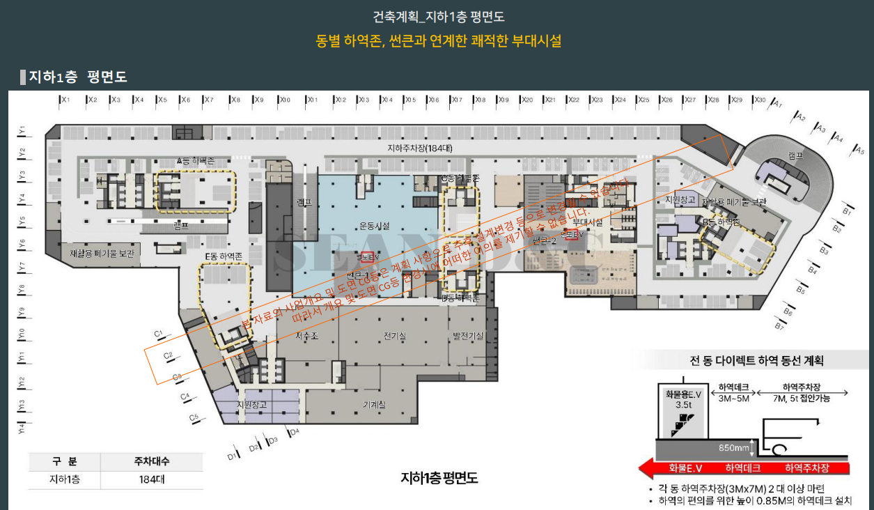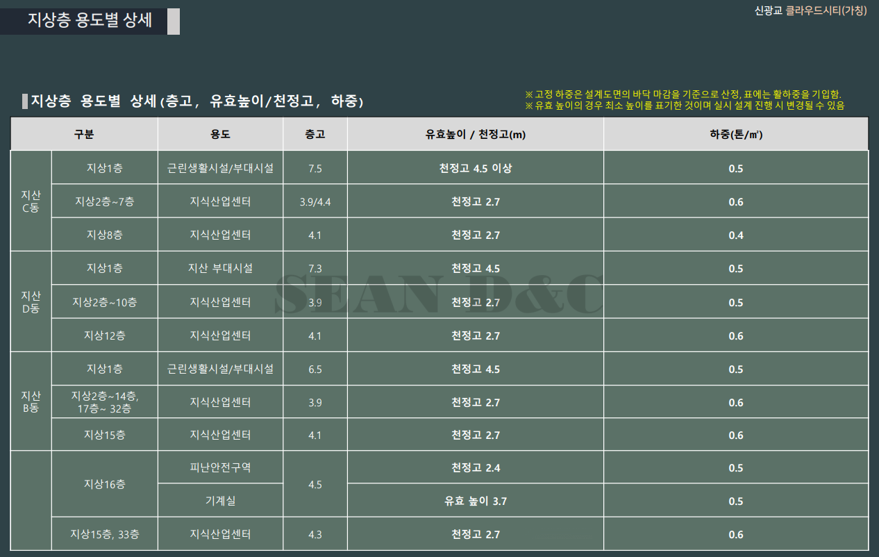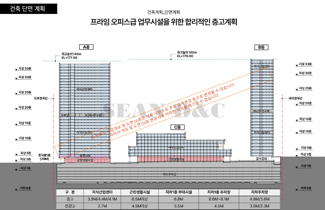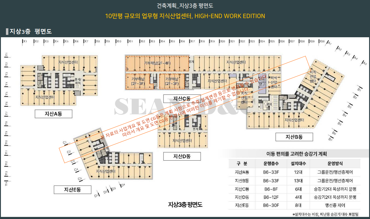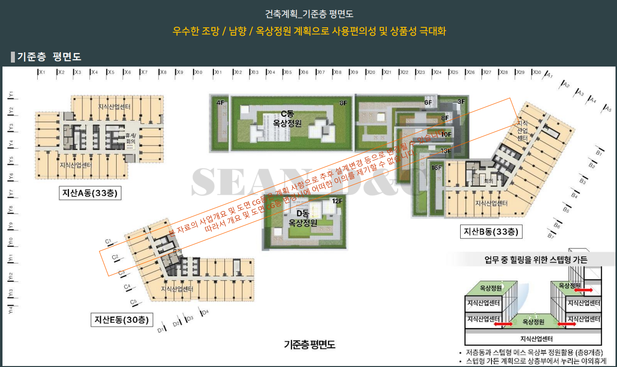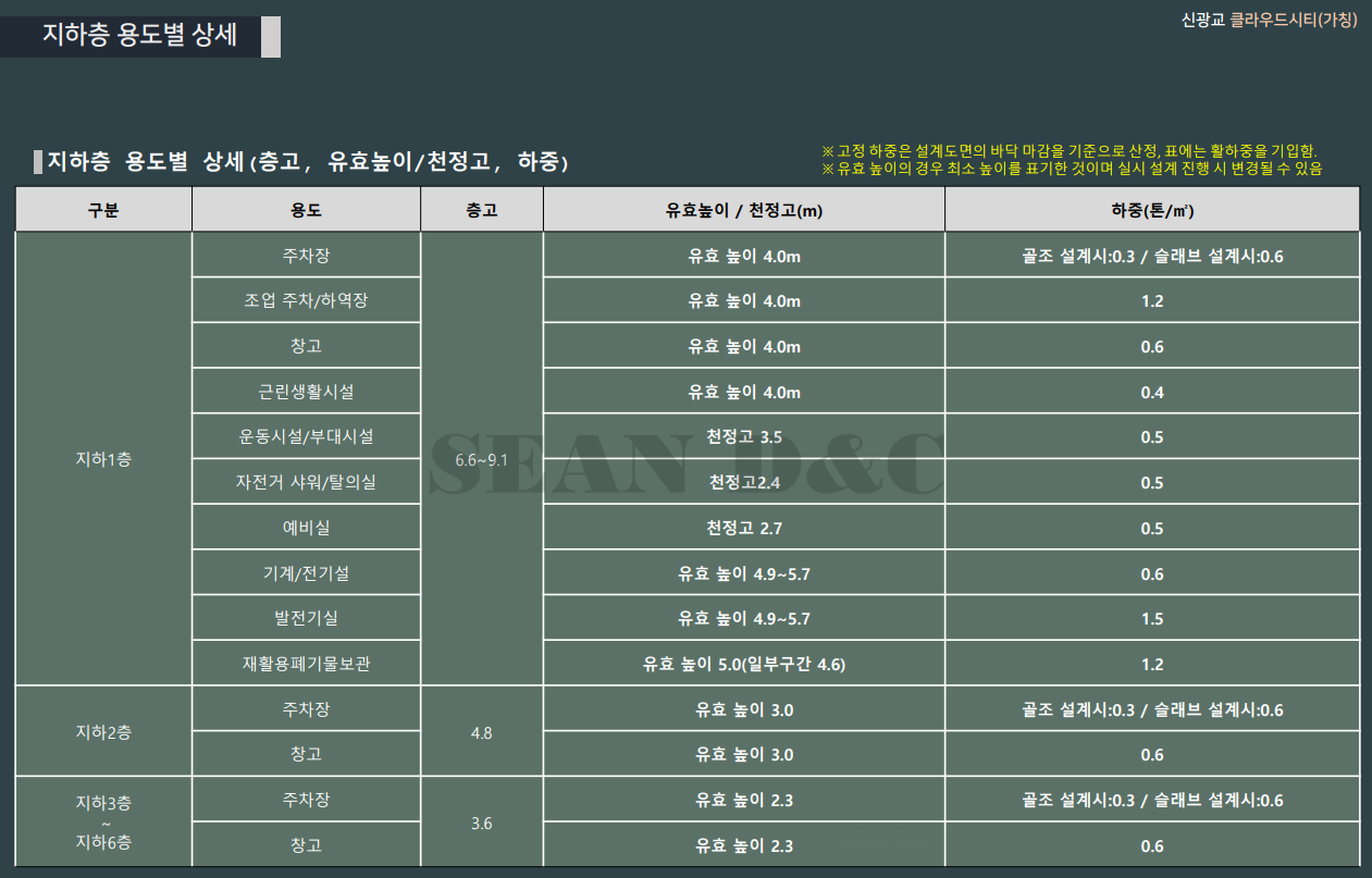 층별 구성을 보면 B6F~B1F는 주차장 공간으로 지하 1층은 조업주차를 고려해 유효높이 4m로 설계됩니다. 같은 층에 선큰 설계로 운동시설 및 부대시설을 쾌적하게 이용할 수 있도록 하였고요. 지상 1층에는 근린생활시설, 3층부터 지식산업센터가 시작됩니다.