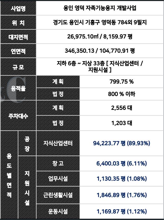 사업 개요를 보시면 용인시 기흥구 영덕동 784 외 9개 필지에서 연면적 약 10만 5천 평으로 개발되는 본 프로젝트는 국내 1%의 압도적 스케일을 자랑하는데요. 2024년 시공능력평가 4위와 신용 AA 등급의 현대엔지니어링이 시공사로 참여해 브랜드 프리미엄까지 더합니다.