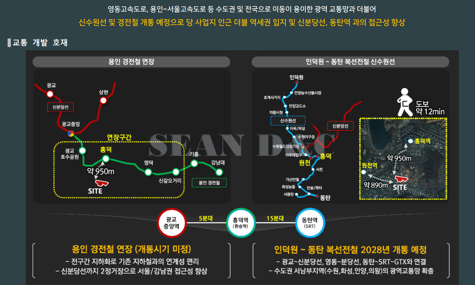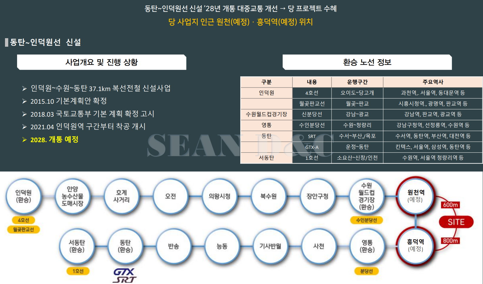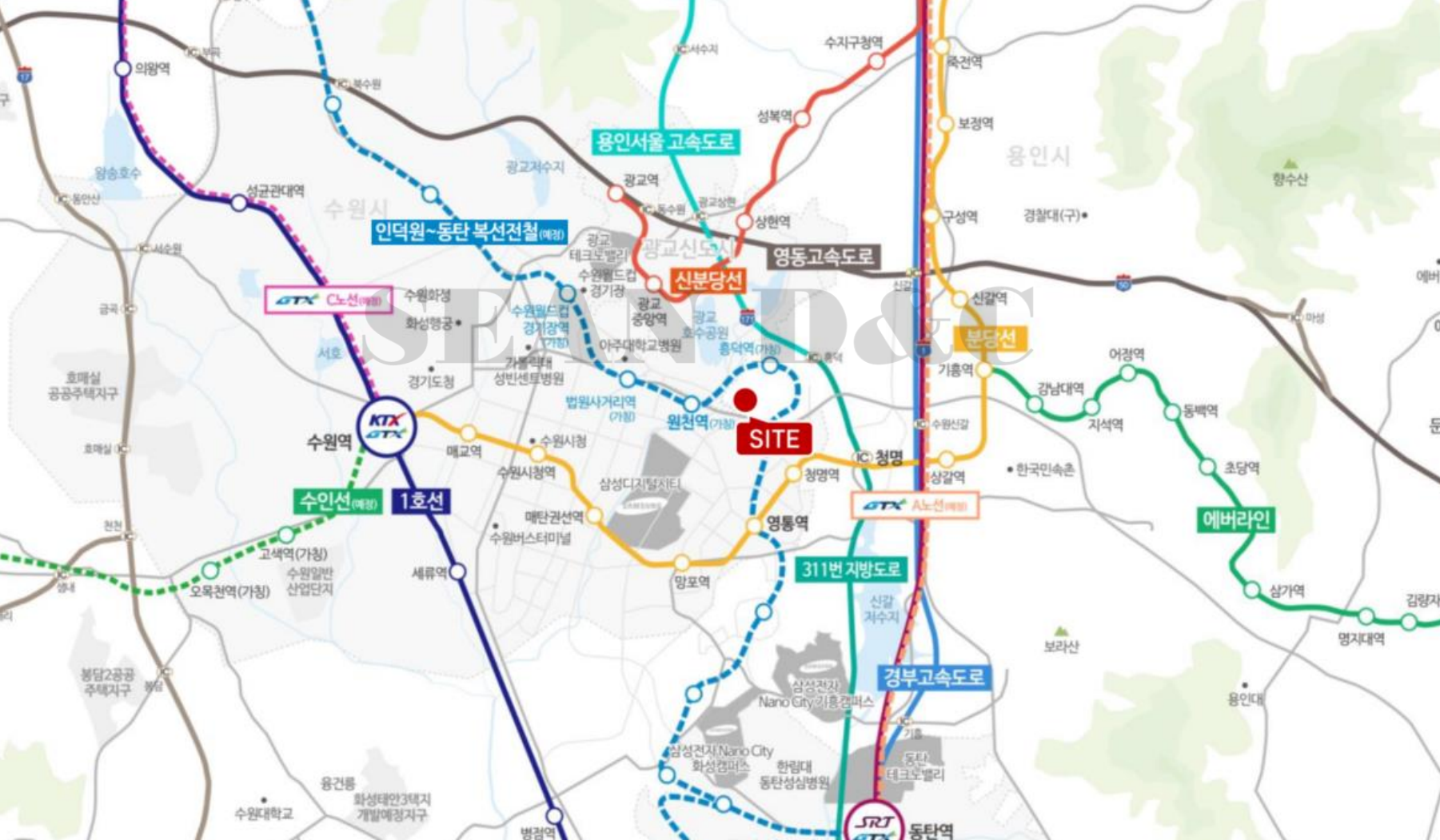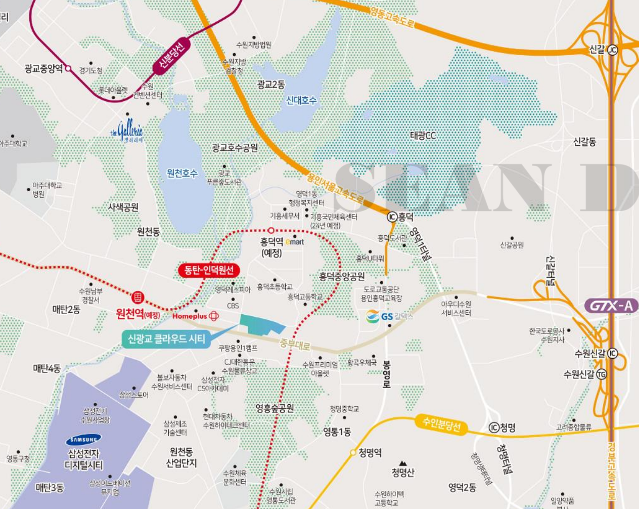 또 분당선 영통역과 망포역이 차량 5-7분으로 도보가 가능하고 자동차로 3분 거리에 신설되는 동탄인덕원선 원천역에서는 월곶판교선, 동탄역 SRT, GTX-A 구성역과의 환승이 가능해집니다. 향후 용인선이 연장되면 흥덕역과 연결되는 더블 역세권으로 경기도 남부권 최적의 교통망 요충지로 자리 잡을 전망입니다.