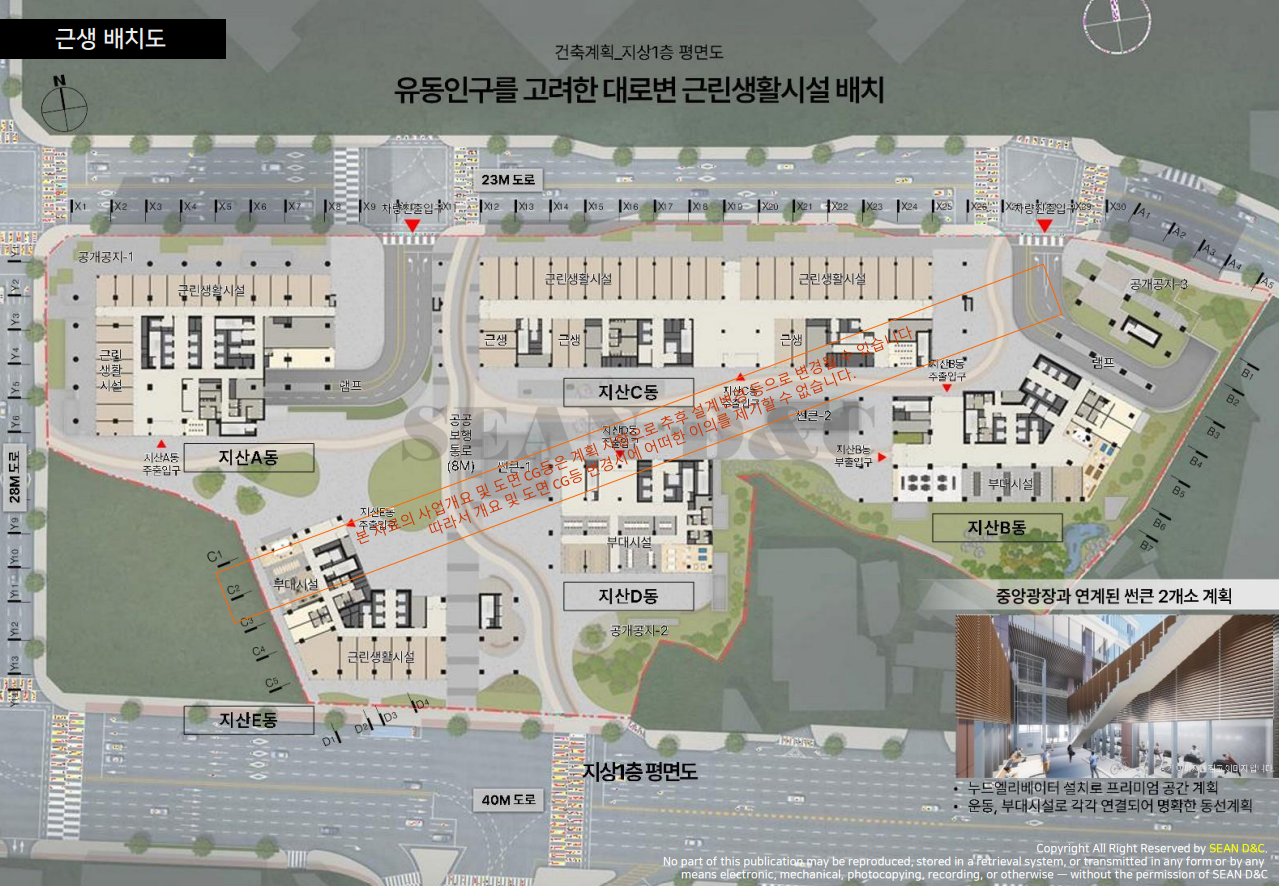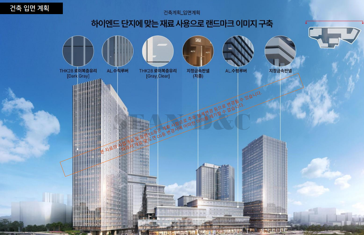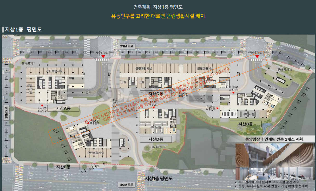 배치도를 보면 대로변을 따라서 타워형 구조물이, 중앙에는 저층부 건물이 들어서고요. 차로 폭은 6.5M 이상으로 여유롭게 설계하여 전반적으로 탁 트인 느낌을 줍니다. 또 내부에 세미나실과 유튜브 스튜디오, 회의실, 힐링 스폿, 리셉션 라운지 등 커뮤니티도 다채롭게 마련됩니다.