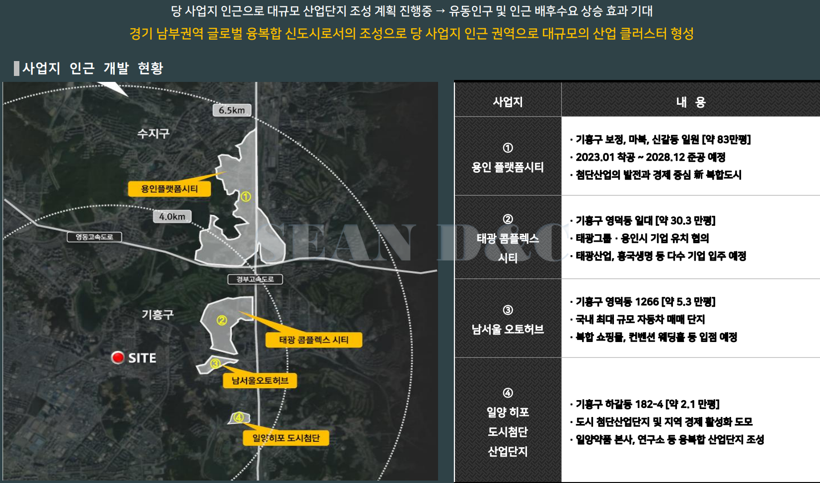 공급 위치를 보시면 교통은 수원신갈IC가 약 4.7km 거리로 경부고속도로 이용이 용이하고, 바로 앞 42번국도 중부대로를 통해 주변 산단으로 이동하기도 편리합니다. 용서고속도로 흥덕IC는 약 2.9km 거리이고, 영동고속도로 동수원IC까지는 약 5.7km로 사통팔달 연결된 광역교통망을 갖추었습니다.