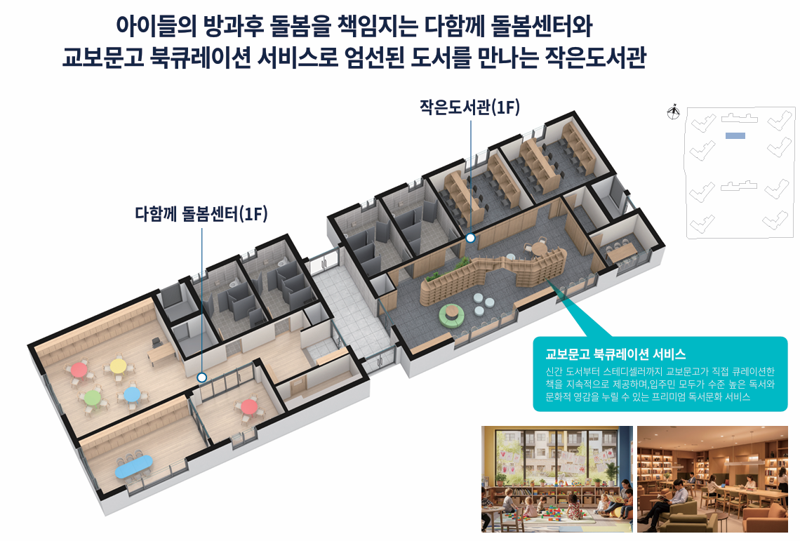 상층부에는 스카이라운지가 마련되어 시티뷰를 조망할 수 있도록 계획되었으며, 교보문고 북큐레이션 도입, 게스트하우스 운영, 세대별 개별창고 제공 등 생활 편의성을 강화하였습니다.
