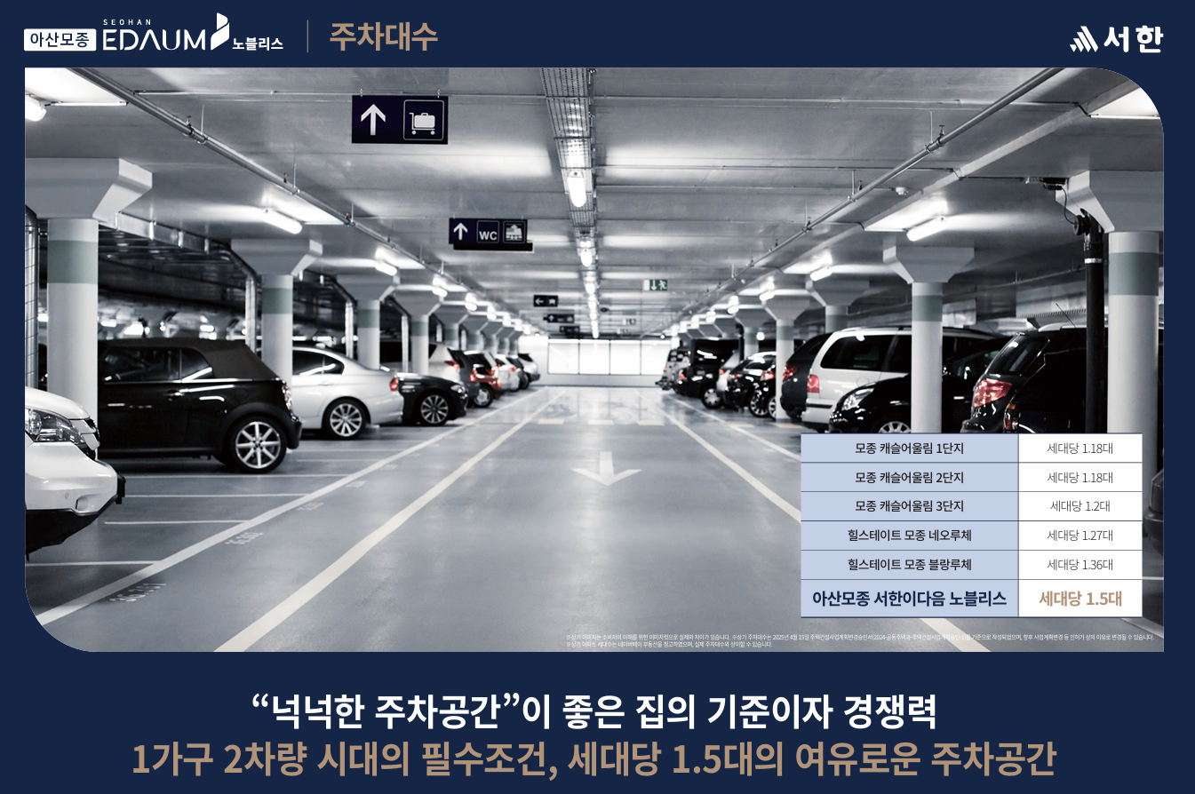 아산모종 서한이다음 노블리스 단지는 지하 2층~지상 29층 높이의 공동주택 10개 동으로 구성되어 총 1,079세대 규모의 중대형 단지로 조성되었는데요. 특히 지하 주차장은 약 1,600대 이상을 수용해 가구당 1.5대 수준의 확보율을 기록하며, 주변 지역 대비 쾌적한 수준이었습니다.